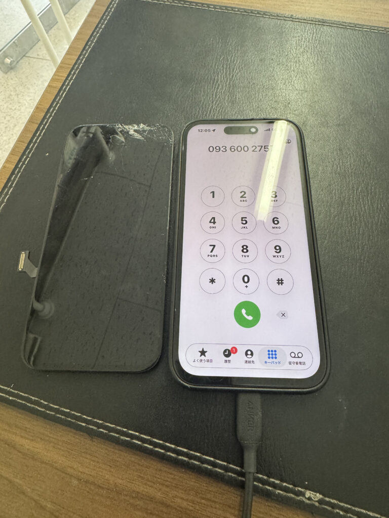 今回のiPhone15も、表面ガラスには大きな割れがなく、一見すると軽度な症状に見えました。しかし、点灯確認を行うと画面下部に表示ムラがあり、タッチ反応も不安定な状態でした。